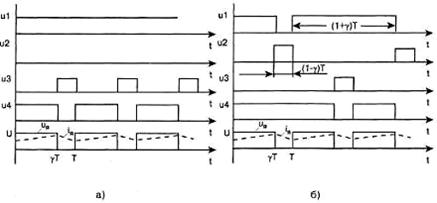 Рисунок 2.10. Способы управления СТК ШИП Несимметричное управление представлено на рис. 2.10а. В этом случае переключаются транзисторные ключи фазной группы ТКЗ и ТК4 (ключи ТК1 и ТК2 при противоположной полярности входного сигнала), транзисторный ключ ТК1 постоянно открыт и насыщен, а ключ ТК2 постоянно закрыт. Транзисторные ключи ТКЗ и ТК4 переключаются в противофазе, обеспечивая протекание тока якоря от противо-эдс двигателя. При этом на выходе ШИП формируются однополярные импульсы и среднее напряжение на выходе равно нулю, когда относительная продолжительность включения одного из нижних по схеме рис. 2.9 транзисторов Уо = 0. Недостатком рассмотренного способа управления является то, что верхние по схеме транзисторные ключи (ТК1, ТКЗ) по току загружены больше, чем нижние. Этот недостаток устранён при поочерёдном управлении, временные диаграммы которого изображены на рис. 2.10б. Здесь при любом знаке входного сигнала в состоянии переключения находятся все четыре транзисторных ключа моста, при этом частота переключения каждого из них в два раза меньше частоты напряжения на выходе. Управляющие напряжения транзисторных ключей одной фазы моста ТК1, ТК2 и ТКЗ, ТК4 постоянно находятся в противофазе; при этом ключи переключаются через период выходного напряжения Т. Этим достигаются одинаковые условия работы полупроводниковых приборов в мостовой схеме. При некотором знаке входного сигнала управляющие импульсы ul, u4 длительностью t = (1+у) Т подаются на диагонально расположенные транзисторные ключи (рис. 2.10) со сдвигом на полпериода, а управляющие импульсы u2, u3 длительностью t = (l-y) T, также со сдвигом на полпериода, подаются на транзисторы противоположной диагонали (ТК2, ТКЗ). В этом случае на интервале нагрузка подключена к источнику питания с помощью диагонально расположенных ключей, а на интервале (1-у) Т нагрузка закорочена с помощью верхних или нижних транзисторных ключей. При изменении знака входного сигнала порядок управления диагональными ключами изменяется на противоположный. При поочерёдном управлении на нагрузке формируются однополярные импульсы длительностью T, пропорциональной сигналу на входе. Обобщенная функциональная схема управления транзисторным ШИП изображена на рис. 2.11. Она содержит генератор (Г), генератор пилообразного напряжения (ГПН), схему сравнения (СС), распределитель импульсов (РИ) и усилители (У). Как правило, между усилителями сигнала управления и распределителем включены элементы гальванической развязки (оптотранзисторы). Диаграммы на рис. 2.11 поясняют принцип работы схемы управления ШИП.
