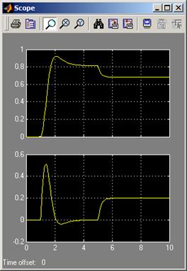 Рисунок 3.2б. Результаты моделирования ДПТ с независимым возбуждением Модель имеет два входа управления: (Uя) – управление по цепи якоря, (С/в) – управление по цепи возбуждения и один вход по возмущению (Мн) – возмущение по моменту нагрузки. Блок (TransferFcn) моделирует цепь возбуждения (постоянная времени цепи Тв = 0,5 с). Блок (TransferFcnl) моделирует цепь якоря (постоянная времени Т = 0,02 с). Блоки (Product, Product1) реализуют умножение в соответствии с уравнением 2 и 3 системы (3.3). Блоки (Sum1, Gain, Integrator) реализуют третье уравнение системы (3.3). На рис. 3.2 бпредставлены результаты моделирования двигателя, управляемого по цепи якоря. Управление по цепи возбуждения подается намного раньше для того, чтобы к моменту подачи управляющего и возмущающего воздействия поток в машине уже установился. Как следует из рис. 3.2б, все время моделирования принято равным 10 с, сигнал по управлению подается спустя 2 с с начала моделирования, а возмущение – спустя 5 с с начала моделирования. На рис. 3.2 бпредставлен переходной процесс по моменту и по скорости. В двигателе с независимым возбуждением поток можно считать постоянным. В этом случае модель двигателя упрощается, такая модель представлена на рис. 3.3. В дальнейшем эта модель будет использована для синтеза электропривода при управлении по цепи якоря.