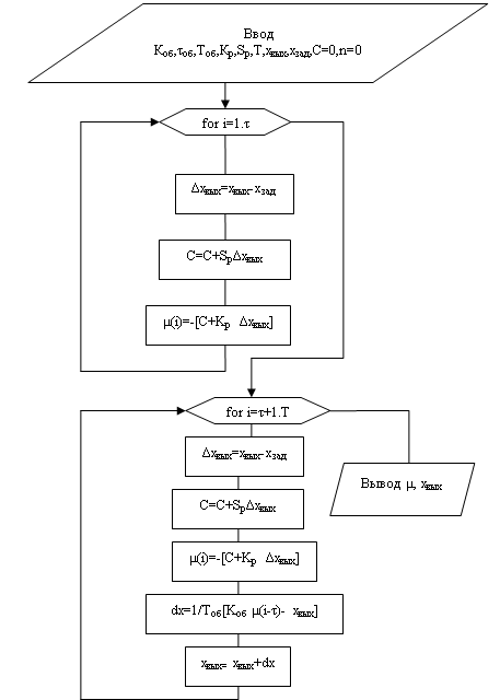 Рис.16. Блок схема алгоритма нахождения значений настроек регулятора Алгоритм расчета переходного процесса Алгоритм включает следующие предписания (рис.17): - вводятся значения Коб,τоб, Тоб, Кр,Sр, Т, хвых, хзад, С=0,n=0; - вычисляется значение отклонения регулируемой величины Δхвых; - значение управляющего воздействия μ за время запаздывания τ объекта; - вычисляются значения управляющего воздействия μ и выходной переменной объекта хвых на каждом моменте времени до времени Т, пока установится процесс, т.е. значение выходной переменной не станет приблизительно равной значению хзад. По результатам вычислений строится переходная характеристика процесса (см раздел по разработке системы стабилизации рис.9). Программа реализации данного алгоритма на Matlab: function per_pro (y,yz,T,dt,r) a= [1: p]; k=2.5; K=0.68; S=0.016; T=60; t=26; C=0; i=1; while i<=t n=0; dy=y-yz; while n<r C=C+S*dy*dt; n=n+1; end m (i) =- (C+K*dy); y1 (i) =y i=i+1; end for i=t+1: p n=0; dy=y-yz; while n<r C=C+S*dy*dt; n=n+1; end m (i) =- (C+K*dy); n=0; while n<r Dy=1/T* (k*m (i-t) - y) *dt; y=y+Dy; n=n+1; end y1 (i) =y i=i+1; m; y1; end plot (a,y1) end
