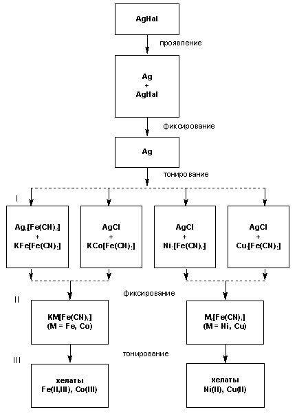 В принципе такого сокращения можно достигнуть двумя путями. Первый из них, в последние годы широко распространившийся, сводится к изготовлению галогенсеребряных фотоматериалов со сниженным удельным содержанием серебра. В этом случае либо используют микрокристаллы AgHal с повышенной чувствительностью к тому или иному виду излучения, либо - что проще - увеличивают дисперсность элементного серебра в полученном после стандартной процедуры (проявления и фиксирования) изображении. Но вот беда - содержащееся в нем серебро остается у потребителя и фактически безвозвратно теряется. Более того, зачастую уменьшенное содержание серебра в таких фотоматериалах вызывает снижение чувствительности к излучениям отдельных видов, прежде всего - ионизирующих. Указанных недостатков можно избежать, если пойти по другому пути - регенерировать серебро, извлекать его из уже полученного изображения. Достигается это такой химической обработкой, в ходе которой содержащееся в нем элементное серебро заменяется тем или иным интенсивно окрашенным соединением, а само переходит в какой-либо из применяемых растворов, откуда может быть извлечено и вновь направлено в производство. В настоящее время уже широко распространился вариант регенерации серебра с образованием несеребряных изображений из органических красителей. Это не что иное, как хорошо знакомая читателю цветная фотография. Однако все такие красители имеют один “генетический” порок - они малоустойчивы к действию света и агрессивных агентов окружающей среды, а потому изображения сравнительно быстро выцветают. (Пример подобного процесса можно было воочию наблюдать в 80-е годы в Москве на Ленинградском вокзале: висевшее в его северной части, рядом с перроном, яркое фотопанно с изображением экспресса ЭР-200 полностью выцвело всего за каких-то три-четыре года. И это несмотря на то, что оно не подвергалось действию прямого солнечного света!) Такой порок можно устранить, если в качестве носителей фотоизображения использовать металлохелаты - своеобразную и интересную группу координационных соединений ионов разных металлов с органическими реагентами. Металлохелаты достойны пристального внимания и сами по себе, но здесь мы ограничимся лишь применением их в фотографии. В обширном мире разных несеребряных изображений те, что получают на основе металлохелатов не имеют аналогов как по своим оптическим характеристикам, так и по способам формирования. Столь необычные носители фотоизображений вполне заслуживают специального обсуждения, тем более что до начала наших работ химико-фотографической науке они вообще не были известны. Для химической обработки галогенсеребряных фотоматериалов используется немало реагентов, которые переводят находящееся в изображении элементное серебро в одно из его соединений - обычно в галогенид AgHal или гексацианоферрат(II) Ag4[Fe(CN)6]. Одновременно с этим в фотослое осаждаются другие металлсодержащие вещества. В состав наиболее известных реагентов, применяемых для тонирования, входят гексацианоферрат(III) калия K3[Fe(CN)6], растворимая соль 3d-элемента (как правило, хлорид или сульфат) и дикарбоновая кислота (обычно щавелевая) или оксикислота (например лимонная или винная). При обработке уже сформированного после проявления и фиксирования серебряного изображения такими ре