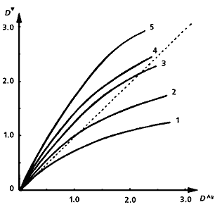 Несеребряные изображения, полученные из металлохелатов. Под каждой фотографией приведен график зависимости оптической плотности хелатного изображения D' от оптической плотности первоначального серебряного снимка DAg при разной длительности третьей стадии процесса - образования металлохелатного соединения. Слева направо: изображение из хелата никеля с диметилглиоксимом (его концентрация - 5·10-2 моль/л); из хелата никеля с дитиооксамидом (концентрация - 2·10-2 моль/л.); изображение, полученное из хелата меди с дитиооксамидом (2·10-2 моль/л); из хелатного соединения кобальта с тем же реагентом (концентрация - 8·10-3 моль/л). Оптические плотности измерены за зеленым, желтым, красным и синим светофильтрами, соответственно. Длительность третьей стадии процесса: 1 мин (1), 2 (2). 4 (3), 6 (4), 10 мин (5). Процесс образования хелата (D') усиливается или ослабляется, по сравнению с исходным изображением (DAg; штриховая прямая), в зависимости от того, сколько времени продолжается третья стадия. С практической точки зрения, безусловно, наиболее ценными в качестве носителей несеребряных изображений были бы хелаты двух- или трехвалентного железа - наиболее дешевого и доступного металла среди всех других. Их применение в подобном качестве, однако, ограничивается тем, что в большинстве своем они сравнительно мало устойчивы и довольно-таки растворимы в воде, да и поглощение ими света в видимой области спектра невелико. Вот почему ассортимент хелатов железа, пригодных для формирования фотографических изображений, весьма невелик: в настоящее время это лишь хелаты Fe(II) c 8-гидроксихинолинами и Fe(III) с 8-меркаптохинолинами. Чтобы получить такие снимки, сначала исходное серебряное изображение выдерживают в растворе, содержащем “смешанный” (на языке современной координационной химии - гетеролигандный) комплекс трехвалентного железа с лимонной и винной кислотами и все тот же ион [Fe(CN)6]3-, в результате чего образуется металлгексацианоферрат - промежуточное несеребряное изображение синего цвета. За счет последующего взаимодействия этого МГФ с 8-гидроксихинолином синтезируется металлохелатное соединение - носитель окончательного серовато-черного изображения. Цветом оно похоже на первоначальное серебряное, но оптические плотности D' его в целом выше. В ходе процесса образуется преимущественно лишь одно соединение - бис(оксинато)железо(II), поэтому не удивительно, что оптические плотности D' монотонно нарастают по мере увеличения DAg. Если для синтеза металлохелата использовать 8-меркаптохинолин, промежуточного изображения не будет, так как двухвалентное железо в координационном соединении под воздействием атмосферного кислорода сразу же окисляется в трехвалентное. Полученная в итоге фотография имеет различные оттенки красно-коричневого цвета. Вне всякого сомнения, носителями фотоизображения могут быть и хелаты других ионов металлов, в частности Ti(IV), Cr(III), Mn(III), Zn(II), Sn(II). Сие, однако, экспериментально никем (в том числе и автором этих строк) пока не подтверждено, так что их синтез и детальное изучение еще впереди. Увеличение ассортимента металлохелатных изображений достижимо и другим путем - за счет химических реакций иных типов: электрофильного замещения, темплатного синтеза, присоединения p-акцепторных соединений и др. Все это - настоящая золотая (во всяком случае - с