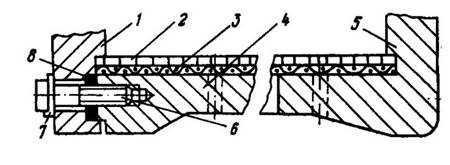 Рисунок 3 – Ротор горизонтальної автоматичної центрифуги: 1 – днище; 2 – обичайка; 3 – передній борт; 4 – перфороване кільце; 5 – перфорована планка; 6 – болт; 7, 8 – фільтрувальне та дренажне сита; 9 – шайба На рисунку 4 зображено елемент ротора центрифуги, у якому застотосовані швидкоз'ємні притискувачі фільтрувальної основи. До обичайки сита притискують з кожного боку шістьома сегментами 4 з листової сталі з привареними бобишками 3. Стопоріння притискного гвинта 1 здійснюється контргайкою 2. По ширині ротора сито накладають унаклад та зшивають дротом. Ротор малогабаритної центрифуги ФГН-63 (рисунок 5) на відміну від роторів інших центрифуг має з'ємний борт 1, котрий кріпиться до перфорованої обичайки 4 болтами 6 і стопорними шайбами 7. Для кріплення сит днище ротора 5 має кільцеву канавку, а з'ємний борт – западину, куди вкладаються краї фільтрувального 2 та дренажного сита З.