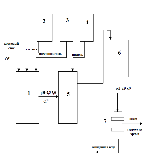 При обработке хромсодержащих сточных вод на установках периодического действия рекомендуется использовать два реактора, причем полезный объем каждого из реакторов следует принимать равным расчетному часовому расходу сточных вод. При обработке стоков на установках непрерывного действия полезную емкость реактора рекомендуется принимать равной 30-ти минутному расчетному расходу. После окончания реакции восстановления Сг6+ в кислой среде сточные воды подвергают нейтрализации с целью осаждения Сг3+ в виде гидроксида по реакции Сr3+ + ЗОН-→ Сr(ОН)3↓. На установках непрерывного действия нейтрализацию кислых вод, содержащих Сг3+, проводят после их предварительного смешивания с другими кислыми и щелочными сточными водами гальванопроизводства. На установках периодического действия иногда хромсодержащие сточные воды нейтрализуют отдельно от сточных вод других видов. Для нейтрализации обычно используют известковое молоко, в более редких случаях - соду и едкий натрий. Оптимальная величина рН для осаждения Сr(ОН)3 составляет 8,5-9, при выходе за эти пределы растворимость Сг(ОН)з увеличивается и, как следствие, ухудшается полнота извлечения гидроокиси хрома из сточных вод. При рН >12 амфотерная гидроокись Сг3+ в избытке щелочи образует растворимые хромиты: Сr(ОН)3 + ЗNаОН →Nа3[Сr(ОН)6], или Сr(ОН)3 + 3ОН-→ [Сr(ОН)6]3-. Принципиальная схема очистки хромсодержащих сточных вод с начальной концентрацией ионов хрома (VI) до 600 мг/л реагентным методом представлена на рисунке.