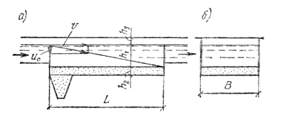 Рис 2. Схема горизонтальной песколовки. а) продольный разрез; б) поперечный разрез При расчете горизонтальных и аэрируемых песколовок следуют определять их длину Ls, м, по формуле