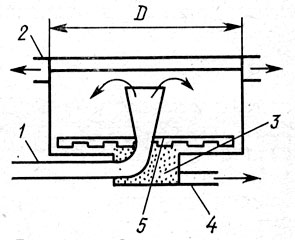 Рис.5. Схема радиального отстойника 1 - входная труба; 2 - отводящая труба; 3 - шламосборник; 4 - канал вывода шлама; 5 - механический скребок Расчетное значение гидравлической крупности u0, мм/с,