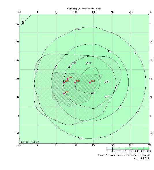 Рис. 12. Приземная концентрация хорошо растворимых фторидов Список используемой литературы «Методические указания по разработке проектов нормативов образования отходов и лимитов на их размещение», утвержденные приказом МПР РФ от 11 марта 2002 г. №115. «Санитарно-защитные зоны и санитарная классификация предприятий, сооружений и иных объектов», СанПиН 2.2.1./2.1.1.1031-01. «Порядок накопления, транспортировки, обезвреживания и захоронения токсичных промышленных отходов (санитарные правила)», М., 1985 г., Минздрав СССР. «Гигиенические требования к размещению и обезвреживанию отходов производства и потребления. СанПин 2.1.7.1322-03», утвержденные 30 апреля2003 г. СНиП 3170-84 «Предельное содержание токсичных соединений промышленных отходов, обусловливающих отнесение этих отходов к категориям по токсичности», от 18.12.1984 г. «Методические указания по оценке степени опасности загрязнения почвы химическими веществами», М., 1987 г., Минздрав СССР от 13.03.1987 г. N'4266-87. Санитарные правила по определению класса опасности токсичных отходов производства и потребления. СП 2.1.7.1386-03", утвержденные 16.06.03 г. Приказ МПР России от 02 декабря 2002 г. № 786 «Об утверждении федерального классификационного каталога отходов». «Правила пожарной безопасности в Российской Федерации», ППБ-01-03. Методика проведения инвентаризации выбросов загрязняющих веществ в атмосферу для автотранспортных предприятий (расчетным методом). М., 1998 г. Инструкция по инвентаризации выбросов загрязняющих веществ в атмосферу. Л.,1998. СанПиН 2.2.1/2.1.1.1200-3 Санитарно-защитные зоны и санитарная классификация предприятий, сооружений и иных объектов: Санитарно эпидемиологические правила и нормативы.-М.: Федеральный центр госсанэпиднадзора Минздрава России, 2003.-48с. |