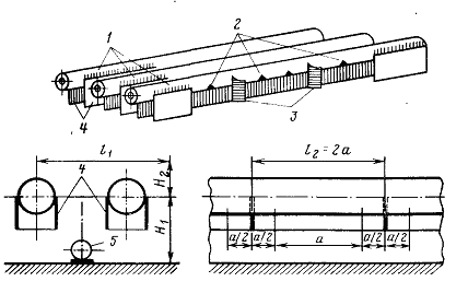Рис. 13.2. Безгравийная трубчатая распределительная система. 1 — водораспределительные трубы; 2 — проходные отверстия; 3 — поперечные перегородки; 4 — боковые шторки; 5 — воздухораспределительная труба В контактных осветлителях с поддерживающими слоями и водовоздушной промывкой следует применять трубчатые распределительные системы для подачи воды и воздуха и систему горизонтального отвода промывной воды. В контактных осветлителях без поддерживающих слоев отверстия в дырчатых трубах должны быть расположены в два ряда в шахматном порядке в нижней части и направлены вниз. Диаметр отверстий 10 ... 12 мм, расстояние между осями в ряду 150 ... 200 мм. Распределительную систему надлежит проектировать в соответствии с рекомендациями СНиПа. В контактных осветлителях без поддерживающих слоев сбор промывной воды производят желобами согласно СНиПу. Над кромками желобов предусматривают пластины с треугольными вырезами высотой и шириной по 50 ... 60 мм, расстояниями между их осями 100 ... 150 мм. Для промывки следует применять очищенную воду. Допускается использование неочищенной воды при ее мутности неболее 10 мг/л, коли-индексе — до 1000 ед/л с предварительной обработкой воды на барабанных сетках (или микрофильтрах) и обеззараживании. При этом должен быть предусмотрен разрыв струи перед подачей воды в емкость для хранения промывной воды. Непосредственная подача воды на промывку из. трубопроводов и резервуаров фильтрованной воды не допускается. Водовоздушную промывку контактных осветлителей следует' осуществлять со следующим режимом: взрыхление загрузки воздухом интенсивностью 18 ... 20 л/(с-м2) в течение 1 ... 2 мин; совместная водовоздушная промывка при подаче воздуха 18.....20 л/(с*м2) и воды 3...3,5 л/(с-м2) при продолжительности 6 ... 7 мин; дополнительная промывка водой с интенсивностью- 6 ... 7 л/(с*м2) продолжительностью 5 ... 7 мин. Продолжительность сброса первого фильтрата при промывке очищенной водой 5... 10, неочищенной — 10... 15 мин. В контактных осветлителях, в отличие от скорых фильтров,, слой воды над загрузкой осветленный, так как вода уже профильтровалась через загрузку. Следовательно, зеркало осветленной воды в контактных осветлителях открыто. Для предотвращения вторичного загрязнения воды оно должно быть изолировано от помещения обслуживания осветлителей. Для этого осветлители группами или каждый в отдельности отделяют от коридора управления остекленными перегородками высотой не менее 2,5 м. Благодаря остеклению можно вести простые визуальные наблюдения за качеством осветляемой воды. Контактные осветлители типа КО-1 с безгравийной загрузкой следует применять для вод с умеренной цветностью и мутностью при небольшом содержании планктона, в остальных случаях — контактные осветлители типа КО-3 (рис. 13.1,б) с гравийно-песчаной загрузкой. В контактных осветлителях типа КО-3 предусматривают две- трубчатые распределительные системы: одна для подачи воды, другая — воздуха. Воздухораспределительная система состоит из дырчатых полиэтиленовых труб, располагаемых у дна сооружения точно посередине между распределительными трубами для воды. В контактных осветлителях типа КО-3 применяют систему горизонтального отвода промывной воды, основными элементами которой являются пескоулавливающий желоб и струенаправляющий выступ (см. рис. 13.1,б). Работа и промывка конт