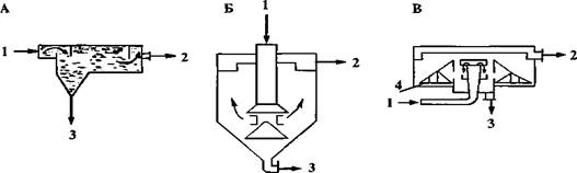 Рис. 1 - Отстойники: А - горизонтальный; Б - вертикальный; В – радиальный: 1 - загрязненная вода; 2 - очищенная вода; 3 - осадок (шлам); 4 - скребковый механизм В горизонтальном отстойнике длина в 8-12 раз больше его глубины. Отстойники бывают непрерывного или периодического действия. В отстойниках непрерывного действия отделение примесей происходит благодаря j резкому уменьшению скорости движения очищаемой жидкости (до 0,005- I 0,01 м/с). Продолжительность прохождения жидкости через отстойник составляет 1-3 часа. Эффективность осветления воды - от 40 до 60%. В отстойниках периодического действия продолжительность отстоя жидкости и составляет несколько часов, после чего происходит удаление всплывших примесей, осветленной воды и осадка. Затем процесс повторяется. Глубина (высота) вертикального отстойника в несколько раз превышает его горизонтальный размер. Разделение твердой и жидкой фаз происходит за счет уменьшения скорости потока и изменения его направления на 180°. Вертикальные отстойники более компактны, однако их эффективность на 10-20% ниже, чем у горизонтальных. В конструкции радиального отстойника реализован принцип действия вертикального и горизонтального отстойников. В центральной его части происходит смена направления потока очищаемой жидкости, а от центра к периферии он работает в режиме горизонтального отстойника. Это позволяет получать достаточно компактные сооружения большой производительности. Эффективность осветления в радиальных отстойниках достигает 60%. Глубина их колеблется от 1,5 до 5 м, диаметр - от 15 до 60 м. В зависимости от вида удаляемых плавающих примесей отстойники могут называться нефтеловушками, жироуловителями и т.п. Эффективность удаления из воды плавающих примесей составляет 95-96%. Всплывшие примеси удаляются с поверхности специальными приспособлениями и направляются на утилизацию. Для удаления из воды волокнистых примесей (частичек шерсти, ниток, асбеста и др.) используется дисковый волокноуловитель, представляющий собой вращающийся перфорированный диск, по которому тонким слоем стекает очищаемая жидкость. Для повышения эффективности процесса осветления к очищаемой в отстойниках жидкости добавляют коагулянты - вещества, которые при взаимодействии с водой образуют хлопьеобразные частицы размером 0,5-3 мм с развитой поверхностью, обладающие также небольшим электрическим зарядом. При оседании эти хлопья захватывают из жидкости взвешенные и коллоидные частицы. В качестве коагулянтов применяются сернокислый алюминий, хлорное железо и др. Расход их составляет от 40 до 700 кг/м3 очищаемой жидкости. Высокие дозы относятся к физико-химической очистке технологических вод, обеспечивающей удаление хрома и цианидов, а также обесцвечивание воды. Интенсификации процесса коагуляции способствует добавка флокулянтов - веществ, обеспечивающих агрегирование пластин коагулянтов и ускоряющих тем самым их осаждение. В качестве флокулянтов применяют клейкие вещества: крахмал, декстрин, силикатный клей. Весьма эффективным является синтетический флокулянт - полиакриламид (ПАА), широко использующийся также при подготовке питьевой воды. Доза применения ПАА колеблется от 0,5 до 25 г/м3 очищаемой жидкости. Внедряются в практику и другие коагулянты и флокулянты на основе активных полимеров, дозы применения которых в десятк