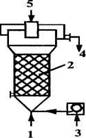 Рис. 2 - Установки ионообменной отчистки: А - периодического действия; Б - непрерывного действия: 1 - загрязненная вода; 2 - гранулы ионита; 3 - раствор для регенерации ионита; 4 - очищенная вода; 5 - добавка ионита Другим универсальным и высокоэффективным методом очистки вод является сорбция. Сорбция применяется преимущественно для очистки сточных вод, которые содержат высокотоксичные вещества, неподдающиеся биохимическому окислению. Метод сорбционной очистки основан на адгезии (прилипании) растворенных веществ поверхностью и порами сорбента - вещества, обладающего разветвленной внешней и внутренней (поры) поверхностью. Наилучшим сорбентом является активированный уголь. Сорбционными свойствами обладают золы, шлаки, опилки, коксовая крошка, торф, керамзит и др. Конструкции установок сорбционной очистки аналогичны ионообменным. Высокая эффективность очистки достигается в установках с псевдосжиженным ("кипящим") слоем, когда в полую вертикальную колонну снизу под давлением подается очищаемая вода, проходящая через слой сорбента, который находится во взвешенном состоянии. Отработанный сорбент заменяется новым или регенерируется. При поддержании сорбента в "кипящем" слое, когда достигаются наилучшие условия контакта его внешней и внутренней поверхности с очищаемой жидкостью, эффективность очистки достигает 99%. Если псевдосжиженный слой слеживается, эффективность очистки резко снижается. Флотационная очистка применяется для удаления из воды поверхностно-активных веществ (ПАВ), нефтепродуктов, жиров, смол и др. Процесс флотации заключается в сорбировании содержащихся в воде примесей поверхностью пузырьков воздуха, нагнетаемого в очищаемую жидкость. В практике очистки вод используются напорные, безнапорные, вакуумные и электрофлотационные установки. Наибольшее распространение получили напорные >хтановки (рис. 3). В таких установках вода сначала насыщается воздухом под давлением, а затем подается в открытый резервуар, где происходит выделение пузырьков и сорбирование ими содержащихся в воде примесей. Иногда сжатый воздух подается в нижний слой жидкости, находящейся в резервуаре (флотаторе). Для повышения эффективности очистки воздух подается через пористые (фильтросные) пластины. При вакуумной флотации в флотаторе создается разряжение, способствующее образованию пузырьков воздуха. Для безнапорной флотации используются эрлифтные установки, которые позволяют существенно (в 2-4 раза) снизить затраты электроэнергии на флотационную очистку. Повышению эффективности очистки вод при флотации способствует наличие синтетических поверхностно-активных веществ (СПАВ). Образуемая ими густая стойкая пена повышает степень извлечения из воды эмульгированных и диспергированных примесей. При флотации одновременно достигается дегазация очищаемых вод и насыщение их кислородом.