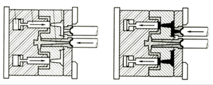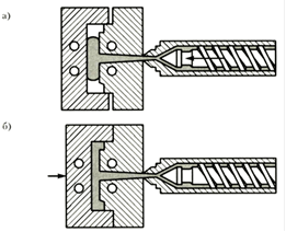 Метод используется для получения изделий значительных по площади прессования, когда заполнение формы сопровождается существенным падением давления расплава в ее периферийных частях, что вызывает эффект разнопрочности изделия. Сущность технологии состоит в том, что давление на расплав в форме создается не только усилием инжекции, но и за счет прессового механизма узла смыкания. С этой целью применяются литьевые формы, конструкция которых допускает перемещение пуансона и после смыкания формы. Инжекционно-газовое литье (ИГЛ)