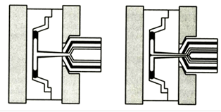 Требует применения сопла специальной конструкции, называемого также разделительной головкой. Эта технология позволяет получать изделия с числом слоев больше двух, с полным или частичным разделением цветов. Литье в многокомпонентные формы (Multi-component injection molding)