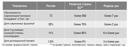 Рис. 30. Ключевые показатели торговли в России и др. странах Рис. 31. Проблемы торговой отрасли России Проблемы, связанные с государственным регулированием сектора торговлиДо последнего времени регулирование отрасли торговли в России характеризовалось низкой степенью вмешательства со стороны государства: - невмешательство в процесс взаимодействия производителей и торговых организаций; - отсутствие механизмов защиты внутреннего рынка от иностранных розничных компаний; - отсутствие ценового контроля по большинству товарных позиций; - отсутствие требований экологического контроля для торговых организаций; - слабое вмешательство со стороны ФАС России; - отсутствие внимания к вопросам подготовки кадров; - отсутствие регулирования оптовых и дистрибуционных компаний; - существенное делегирование полномочий по работе с отраслью регионам. Такая регуляторная политика привела к ряду как положительных, так и отрицательных эффектов для самой отрасли, потребителей и государства. Так, например, отсутствие жёсткого регулирования, с одной стороны, способствовало высокой инвестиционной привлекательности и быстрым темпам развития отрасли, а с другой, привело к возникновению высоких входных барьеров на региональные рынки, выраженных в протекционистских мерах со стороны администраций регионов. Для потребителей основным положительным фактором стало существенное увеличение количества форматов современной торговли, которые позволили снизить цены (по сравнению с традиционными форматами) и повысить качество обслуживания. Однако, с другой стороны, высокая неравномерность развития сектора привела к сильной диспропорции в обеспеченности торговыми площадями современных форматов, уровням цен между различными регионами. Хаотичная застройка муниципальных образований привела к таким проблемам, как ухудшение исторического облика городов и снижение транспортно-пропускной способности. Действующую нормативную правовую базу, регулирующую отношения в сфере торговли, характеризуют: - недостаточная системность действующих нормативных правовых актов, регулирующих отношения в сфере торговли; - избыточность правового регулирования. В отсутствие федеральных экспертизы и контроля за региональным и муниципальным нормотворчеством, избыточность правового регулирования торговых отношений, выражающаяся в принятии актов не только дублирующих федеральные нормативные правовые акты, но и недопустимо развивающих их за пределами предоставленных органам государственной власти субъектов Российской Федерации и органам местного самоуправления полномочий, ведет к созданию серьезных административных барьеров. Анализ нормативной базы субъектов Российской Федерации и отдельных органов местного самоуправления свидетельствует о том, что нередко региональные и муниципальные акты в области торговли в нарушение норм Гражданского кодекса Российской Федерации регулируют гражданско-правовые договоры по заключению и реализации договоров (купли-продажи, розничной купли-продажи, др.). Существенным недостатком региональной нормативной базы в сфере торговли является и то, что до настоящего времени в ряде субъектов Российской Федерации продолжают действовать нормативные правовые акты, принятые в 1992 – 2003 годах в соответствии с существовавшим на т