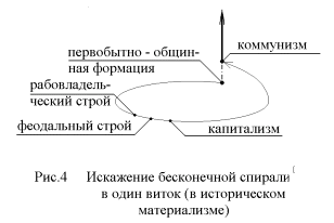 Поэтому классики объединили в своей теории развития цикличность и поступательность первых двух моделей развития. Они отметили, что новые зерна А1, которые даёт растение Б, отличаются от исходных зёрен А своими свойствами: лучшей всхожестью, устойчивостью и т.п., поэтому фактического возврата в исходное состояние в природе не существует. Следовательно, третья модель процесса развития будет выглядеть в виде разрезанной окружности, концы которой не совпадают друг с другом и не образуют кольцо, а находятся один над другим, образуя один виток спирали (винтовой линии, показанной на рис.3). При этом цикличность развития (возврат назад) проявляется в направлении второго отрицания А1 к исходному состоянию объекта А, а поступательность (движение вперёд) в том, что возврат идёт не точно в исходное состояние А, а несколько поднимается над ним по уровню развития. Таким образом, в диалектическом материализме процесс развития представляется в виде движения по спирали, что достигается тем, что второе отрицание не является чисто полярным и возвращает объект не точно назад в исходное состояние, а только лишь “якобы назад”. В этом и заключается сущность первого закона диалектики. В общем плане диалектическое отрицание утверждает более высокий уровень развития. Однако важно иметь в виду следующее. Процесс развития включает в себя множество самых различных отрицаний. "Ни в одной области, — писал Маркс, — не может происходить развитие, не отрицающее своих прежних форм существования" [29]. Но далеко не всякие два отрицания, следующие друг за другом, составляют закон отрицания отрицания. Для проявления этого закона нужно два отрицания, но именно диалектических, т.е. коренных, полных (с непременным восхождением). Вот как, например, описывает Маркс эволюцию форм собственности: "Капиталистический способ присвоения, вытекающий из капиталистического способа производства, а следовательно, и капиталистическая частная собственность, есть первое отрицание индивидуальной частной собственности, основанной на собственном труде. Но капиталистическое производство порождает с необходимостью естественного процесса свое собственное отрицание. Оно восстанавливает не частную собственность, а индивидуальную собственность на основе достижений капиталистической эры: на основе кооперации и общего владения землей и произведенными самим трудом средствами производства" [29]. Диалектика отрицания отрицания просматривается также в Марксовом анализе исторических форм господства и подчинения. Вначале это прямая личная зависимость: раба от рабовладельца, крестьянина от помещика. Затем "личная независимость, основанная на вещной зависимости..." [27]. Это уже капитализм, превращающий общественные отношения из связи между людьми в связь между вещами, функционально отчужденное. Следующая ступень — личная взаимозависимость, при которой "свободное развитие каждого является условием свободного развития всех" [27]. Общество, по Марксу, поднимается на эту ступень лишь в посткапиталистическую, или коммунистическую, эпоху, которая станет разрешением всех исторически назревших проблем. Из таких малых спиралей выстраивается одна большая спираль, спираль общественного развития. Таким образом, в диалектическом материализме процесс развития представляется в виде движения по