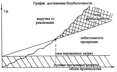 Рис.2. График достижения безубыточности. С помощью такого графика находится так называемая точка безубыточности, т.е. тот объем производства, при котором кривая, показывающая изменение выручки от реализации (при заданном уровне цен), пересечется с кривой, показывающей изменение себестоимости продукции[21, c. 66]. 1.2 Методы и этапы краткосрочного финансового планирования В практике краткосрочного финансового планирования применяются следующие методы: экономического анализа, нормативный, балансовых расчетов, денежных потоков, метод многовариантности, экономико-математическое моделирование. Метод экономического анализа позволяет определить основные закономерности, тенденции в движении натуральных и стоимостных показателей, внутренние резервы предприятия. На основании доступной отчетно-учетной информации оценивается финансовое положение предприятия, его внутренние и внешние отношения. Это позволяет охарактеризовывать его платежеспособность, эффективность и доходность деятельности и другие показатели, а затем по результатам принять обоснованные решения. Сущность нормативного метода в том, что на основе заранее установленных норм и технико-экономических нормативов рассчитывается потребность хозяйственного субъекта в финансовых ресурсах и их источниках. Использование метода балансовых расчетов для определения будущей потребности в финансовых средствах основывается на прогнозе поступления средств и затрат по основным статьям баланса на определенную дату в перспективе. При этом большое влияние должно быть уделено выбору даты: она должна соответствовать периоду нормальной эксплуатации предприятия. Метод денежных потоков носит универсальный характер при составлении финансовых планов и служит инструментом для прогнозирования размеров и сроков поступления необходимых финансовых ресурсов. Метод многовариантности расчетов состоит в разработке альтернативных вариантов плановых расчетов, с тем, чтобы выбрать из них оптимальный, при этом критерии выбора могут задаваться различные [27,c. 78]. Методы экономико-математического моделирования позволяют количественно выразить тесноту взаимосвязи между финансовыми показателями и основными факторами, их определяющими. Только совокупность перечисленных методов позволит сделать разносторонние выводы. Процесс краткосрочного финансового планирования включает несколько этапов [5, c. 98]. На первом – анализируются финансовые показатели за предыдущий период. Для этого используют основные финансовые документы предприятий – бухгалтерский баланс, отчеты о прибылях и убытках, отчет о движении денежных средств. Баланс предприятия входит в состав документов финансового планирования, а отчетный бухгалтерский баланс является исходной базой на первой стадии планирования. При этом западные компании используют для анализа, как правило, внутренний баланс, включающий наиболее достоверную информацию для внутрифирменного пользования. Внешний баланс, обычно составляющийся для публикации, по целому ряду причин (налогообложение, создание резервного капитала и другие) показывает уменьшенные размеры прибыли. Второй этап предусматривает составление основных прогнозных документов, таких как прогноз баланса, отчета о прибылях и убытках, движения денежных средств (движение нали