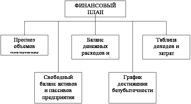Рис.1 Финансовый план организации. II. Баланс денежных расходов и поступлений - это документ, позволяющий оценить, какое количество финансовых ресурсов следует вложить в проект, причем с разбивкой во времени, т.е. до начала реализации, а затем по ходу выполнения поставленной задачи. Следует отметить, что западные предприниматели относятся к планированию денежных потоков более серьезно, чем российские, воспринимающие безналичный оборот средств более индифферентно [24, c. 103]. Главная задача баланса денежных расходов - проверить синхронность поступления и расходования денежных средств, а значит, проверить будущую ликвидность предприятия для определения общей стоимости всего проекта. Таблица доходов и затрат представляет собой документ с достаточно простой структурой и состоит из следующих показателей: доходы от продаж товаров, издержки производства товаров, суммарная прибыль от продаж, общепроизводственные расходы, чистая прибыль. Основная задача этого документа - показать, как будет формироваться и изменяться прибыль (для первого года - помесячно, для второго - поквартально, для третьего - в расчете на год). I. Сводный баланс активов и пассивов рекомендуется составлять на начало и конец первого года реализации проекта. Считается, что этот документ не менее важен, чем баланс денежных расходов и поступлений. Его обычно очень тщательно изучают специалисты коммерческих банков, чтобы оценить, какие суммы намечается вложить в активы разных типов и за счет каких пассивов предприниматель собирается финансировать создание или приобретение этих активов. II. Для более понятного (наглядного) отображения происходящих финансовых процессов формируется график достижения безубыточности.