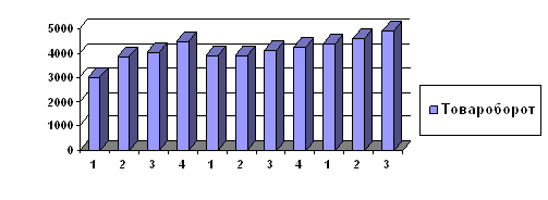 Рис. 10. Расчет величины собственных оборотных средств. СОС на начало2005 года= 11265-3094=8171 (тыс.руб) СОС на начало 2006 года= 8352-2490=5862 (тыс.руб) Положительная величина собственных оборотных средств свидетельствует о том, что при необходимости оплаты текущих обязательств компания обладает достаточными текущими ресурсами без продажи фиксированных активов и возврата долгосрочных инвестиций Отрицательным в данной ситуации является снижение собственных оборотных средств на 2309 тыс.руб. Но тем не менее у предприятия достаточно средств для покрытия всех своих текущих расходов. сновная политика предприятия по финансированию своей деятельности Рассмотрим общие экономические показатели ООО «ЭМУЗИН» (Приложение 4). Объем товарооборота по кварталам изменялся не равномерно (рис. 11).