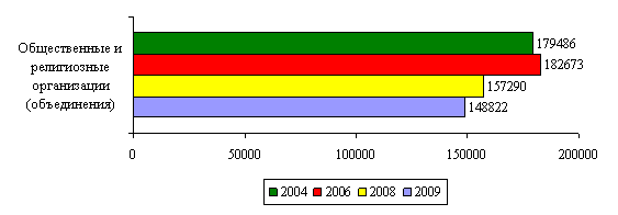 Рис. 3. Число некоммерческих организаций Наиболее многочисленные группы таких организаций – это учреждения, созданные органами государственной и муниципальной власти, а также потребительские кооперативы. Не менее актуальным является вопрос о числе реально действующих российских НКО. Не секрет, что ряд организаций существует только на бумаге, не ведет, по тем или иным причинам, деятельность, предусмотренную их уставами. Такие организации искажают представления о потенциале российского некоммерческого сектора, его ресурсах и способности решать социально значимые задачи. Вместе с тем, информация о динамике численности реально действующих НКО могла бы послужить важным индикатором качества среды, в которой живет российский некоммерческий сектор, а также индикатором состояния гражданского общества: рост числа реально действующих НКО может восприниматься как свидетельство благоприятных условий для деятельности в некоммерческом секторе, как свидетельство роста гражданской активности. При этом, оценка численности реально действующих в нашей стране НКО по международным стандартам позволяет представить, какую позицию занимает Россия в глобальном контексте гражданского общества. Согласно данным всероссийского обследования НКО, в негосударственных некоммерческих организациях по найму на условиях полного или неполного рабочего дня (полной или неполной рабочей недели) трудится 1,13% экономически активного населения России. Среди подростков в 2009 году был велик и потенциал оценки собственной социальной активности. Более двух третей опрошенных подростков считают себя общественно активными людьми (67%). Данные сильно разнятся с опросом взрослого населения. Среди россиян старше 18 лет только чуть больше четверти относят себя к общественно активным людям. Почти каждый пятый тинэйджер ожидаемо сообщает, что не имеет опыта общественной работы (19%). Россиян более старшего возраста, отмечающих данную позицию, в два раза больше. В 2009 году подростки чаще всего занимались общественной работой по месту учебы, но и достаточно часто – по принуждению старших. Однако заметен и тот факт, что подростки и люди старше 55 лет чаще других занимаются общественной работой по месту жительства. Так, участие в каких-либо мероприятиях, организованных самими гражданами по месту жительства (субботниках, ремонте, собраниях жильцов, дежурстве) привлекает значительную часть подростков (37%). Это является достаточно высоким показателем, учитывая, что подростки больше ориентированы на учебу и общение. В 2009 году в школьных организациях состояло 16% подростков, в объединениях неполитического характера – 15%. Участники молодежных политических организаций составляют 5%, что является существенным показателем для молодого поколения. Подводя итог, необходимо отметить, что прирост структурных элементов гражданского общества совсем невелик, однако при рациональной стратегии развития гражданского общества этот показатель может быть значительно увеличен. гражданский общество социальный россия2.4 Направления развития гражданского общества в России: cтратегия и необходимые действияРазвивающееся российское общество многолико и разнообразно. Несмотря на далекие от тепличных условия, в которых на протяжении десятилетий оформлялись и заявляли о себе социальные