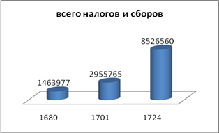 Рисунок 4. Сопоставляя данные росписи 1724г. с росписями 1680 и 1701 гг., можно видеть, насколько увеличился окладный доход государства (рис.1,2,3,4). В 1680г. он составлял 1 463 977 руб., в 1701г – 2 955 765 руб., а в 1724г. – 8 526 560 руб. (рис. 4). Однако, при оценке этих цифр необходимо прежде всего принять в расчет, что возрастание ценности государственного дохода не вполне соответствует возрастанию его цифровой величины. Дело в том, что за то же время, к которому относятся эти данные, рыночная стоимость рубля упала почти наполовину: рубль конца XVII века равнялся 17 рублям начала XX века, а рубль первых десятилетий XVIII века только 9-ти, из чего можно сделать вывод, что доходная часть государственного бюджета выросла по сравнению с 1680г. более чем в 3 раза и по сравнению с 1701 более чем в 2 раза. Что касается составных частей государственного дохода, - главный тон переменам в их процентных отношениях давало в 1701г. чрезвычайное увеличение регального дохода, а именно, прибыли от монетной операции. В 1724г. абсолютная цифра этого дохода увеличивается благодаря соляной продаже, но процентное отношение его к другим доходам падает; и абсолютно пропорционально первое место в бюджете занимает только что введенная подушная подать: теперь она превышает половину всех поступлений, тогда как непосредственно перед введением подушной статьи прямые сборы не составляли и трети (31%) их. [13] 2.3 Реформа финансового аппарата До Петра I сбор налогов осуществлялся рядом финансовых приказов. До 1717 г. приказная система сохраняется, но подвергается существенным изменениям: создаются новые приказы, изменяются сферы деятельности старых приказов. Указом Петра I от 30 января 1699 г. в Москве учреждается Бурмистерская палата (в конце 1699 г. переименованная в Ратушу) — центральное административно-финансовое и судебное учреждение, которое осуществляло общий контроль за земскими избами (выборными органами земского самоуправления), ведала раскладкой и сбором податей и повинностей с населения Москвы и посадов. В ее ведении находились также торговые и гражданские дела. Во главе Бурмистерской палаты стоял бурмистр. Бурмистерская палата (Ратуша) избиралась из торговых людей и соблюдала интересы купечества, которое привлекалось Петром I к развитию отечественной промышленности. Существенные изменения в системе сбора налогов начинают происходить с изменением административно-территориального деления России и создания должности губернаторов. На них возлагались функции по контролю за сбором налогов. 18 декабря 1706 г. издается Указ «Об учреждении губерний с предписанием начальникам, в тех губерниях о денежных сборах и всяких делах присматриваться, и для подношения Ему, Великому государю, в тех губерниях готовым быть...» В 1710 и 1711 гг. Петр I созывает съезды губернаторов, воевод и бургомистров, на которых разрабатываются основы нового финансового устройства страны по губерниям.[14] Указом от 22 февраля 1711 г. учреждается «управительный» (впоследствии Правительствующий) Сенат — постоянно действующий высший орган государственного управления, в числе других функций выполнявший обязанности контролера в сфере государственных доходов и расходов. Указом от 17 марта 1711 г. Правительствующему Сенату поручается устройство государственных доходов с предписанием «денег как возможно собирать... и...учинить фискалов во всяки
