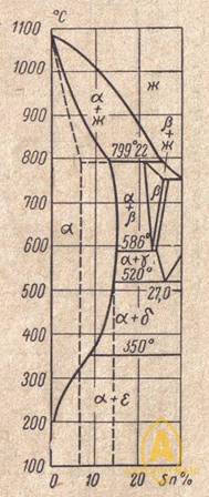 Cu - Sn Диаграмма, показывающая фазовый состав и структуру Cu - Sn-сплавов (оловянистых бронз). Представляет собой комбинацию нескольких перитектических диаграмм. Возможно образование следующих фаз: α - твердый раствор Sn в Cu; Sn - почти чистое олово (растворимость Cu в Sn меньше 0,01 %); β - твердый раствор электронного типа на базе соединения Cu5Sn, а пунктирная линия показывает процесс его упорядочения; δ - электронное соединение Cu31Sn8; γ- твердый раствор на базе химического соединения Cu и Sn; ε - электронное соединение Cu3Sn; η - химическое соединение Cu6Sn5