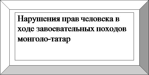 Реферат: Нарушение прав человека в ходе монголо-татарского нашествияРеферат: Нарушение прав человека в ходе монголо-татарского нашествия![]() Реферат по истории Государства и права ученика 9 «В» класса лицея №150 Чистякова Сергея Санкт-Петербург, 2000 годНарушения прав человека в ходе монголо-татарского нашествия. С образованием Монгольского государства началась полоса монгольских завоеваний. Завоевателей увидели на своих землях многие народы: кидани и чжурчжени, тангуты и китайцы, корейцы и тибетцы, таджики и хорезмийцы… Над культурными странами Средневековья пронёсся губительный смерч. Грабительские нашествия кочевников на различные земледельческие страны Азии были обычно опустошительными, прежде всего, характеризовались массовым истреблением способных к сопротивлению элементов населения, террором и запугиванием мирных жителей. При осаде городов пощада населению давалась только в случае немедленной сдачи. Если же этого не происходило, жителей выгоняли в поле, чтобы завоевателям удобнее было ограбить город. Затем ремесленников, молодых женщин и девушек увозили в рабство, а здоровых юношей брали в обоз. Нередко происходило, что завоеватели истребляли население не только городов, но и прилегающих к ним деревень. После "всеобщей резни" в городе Мерве подсчёт убитых продолжался 13 дней. Ремесленников, обращённых в рабство, сначала уводили в Монголию, а затем стали эксплуатировать на месте, т. е. в больших мастерских, принадлежавших хану, царевичам или знати. Труд рабов применялся также в скотоводческих хозяйствах знати. В 1227 году государство Си-Ся перестало существовать, а оставшееся в живых население было превращено в рабов. Последствия завоевания Средней Азии монголами носили катастрофический характер. Разрушены были замечательные ирригационные системы Мервского оазиса, Хорезма и других районов. Завоеватели установили жестокие формы феодальной эксплуатации покоренного оседлого трудящегося населения. Крестьяне и ремесленники, оставшиеся в городах, были задавлены громадными налогами и повинностями, часть была обращена в рабство. Они работали в казённых мастерских на скудном пайке, получая ежедневно только хлеб и лишь три раза в неделю немного мяса.