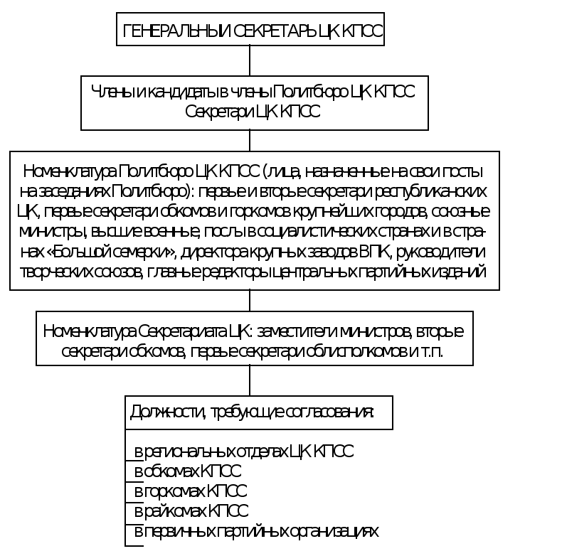 В бывшем СССР корпус элиты рекрутировался из партийных функционеров, верхушки военных, хозяйственных руководителей, комсомольской бюрократии, деятелей культуры и науки. Для придания видимости широкого социального представительства, формально в состав ЦК и Верховного Совета входили рабочие, колхозники, инженеры, ученые. Эта группа «простых советских людей» всегда носила декоративный характер. Советская номенклатура имела жесткую иерархию. Все номенклатурные должности еще во времена Сталина были поделены на определенное число рангов (см рис. 1). Иерархический принцип заключался в том, что человек должен был последовательно продвигаться по служебной лестнице со ступеньки на ступеньку. В советской элите существовали механизмы ограничивавшие семейственность. По неписаным правилам дети крупных чиновников не наследовали посты, которые занимали их отцы. Для «элитных» детей были созданы специальные профессиональные «ниши», в основном связанные с работой за рубежом. Из-за определенных ограничений самовоспроизводства, номенклатура пополнялась в значительной степени за счет выходцев из различных слоев общества: интелегенции, рабочего класса и крестьян. Анализ биографий членов ЦК показывает, как мало в его составе было выходцев из Москвы, почти отсутствовали выходцы из номенклатурных или околономенклатурных слоев. От кандидатов на высокие посты номенклатура требовала опыта работы в разных регионах страны. Традиционная карьера номенклатурщика выглядела так: учеба в Москве; работа в советских, комсомольских, хозяйственных или партийных органах какого-нибудь региона; вызов в Москву и работа один-два года в ЦК КПСС; возвращение в провинцию на более высокую должность (как правило, первым секретарем обкома КПСС). Это было незыблемым принципом «кадровой закалки». Одним из принципов номенклатурной карьеры было изменение сферы деятельности. В брежневский период сложилось несколько типов номенклатурной карьеры: партийно-хозяйственная, партийно-дипломатическая, советско-партийная. Орготдел ЦК перебрасывал человека не только в пространстве, но и из одной управленческой сферы в другую. Наиболее типичной была карьера с переходом с комсомольской работы на партийную, с партийной на советскую и обратно, с хозяйственной на партийную и обратно. Конечно, бывали случаи и «чистых» карьер, чаше всего у хозяйственников. В этом случае человек «рос» на заводе до директора, переходил в министерство и «рос» до министра. Существовала обширная и разветвленная система привилегий для членов номенклатуры. Существование этой системы было обусловлено состоянием советской экономики «дефицита» Этапы трансформации старой элиты. Приход к власти Горбачева ознаменовал начало перестройки не только страны, но и номенклатурной системы. Горбачев уже в первые годы своего правления нарушил незыблемые до него законы функционирования советской элиты. Он устроил кадровую «мясорубку». И прежние генсеки приходя к власти начинали с кадровых перестановок, дабы сколотить вокруг себя команду преданных людей. Такие перестановки проходили, как правило, в первые три года после прихода нового Генерального секретаря, после чего заметных кадровых перестановок больше не происходило, и новая команда работала почти в неизменном составе в течение последующих лет. 