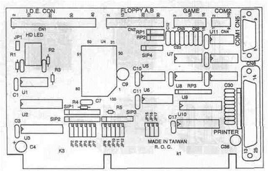 Рис '12.11. Размещение перемычек на плате контроллера портов.