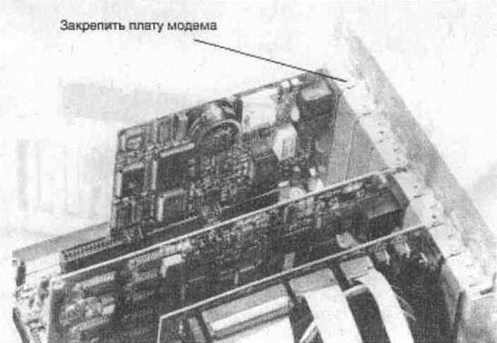 Рис. 12.15. Закрепление платы модема 12.4. Проверка модема 12.4.1. Включение модема После установки модема он готов к включению. При нажатии тумблера питания внешнего модема обычно выполняется его автоматическая самопроверка, в течении которой могут мигать некоторые индикаторы на лицевой панели. После окончания самотестирования модем готов к использованию. Для более тщательной проверки работоспособности модема необходимо воспользоваться какой-нибудь имеющейся в наличии связной программой. Достаточно воспользоваться любой терминальной программой, позволяющей управлять модемом с помощью набора АТ-команд или команд протокола V.25bis. Если же модем имеет буквенно-цифровой дисплей, то его можно полностью протестировать без использования коммуникационных программ и компьютера. 12.4.2. Проверка ответов модема В интеллектуальных модемах на вводимые с компьютера команды модем должен формировать ответы в текстовом либо цифровом виде. При использовании набора АТ-команд на ввод команды "AT" или "at" модем должен ответить сообщением "ОК" или "О". В случае отсутствия ответа следует ввести команду ATQOV1, устанавливающую режим ответа в текстовом виде, и повторить попытку с вводом команды "AT". Если повторная попытка оказалась неудачной, следует еще раз проверить исправность соединительного кабеля и последовательного порта компьютера. В случае ответа модема "ERROR", следует проверить соответствие установленных скоростей связного порта модема и компьютера, либо командой AT\J1 включить режим интерфейса переменной скорости, при котором скорость порта модема автоматически подстраивается под скорость передачи терминалом АТ-команд. Однако надо знать, что далеко не всеми модемами поддерживается такая возможность. 12.4.3. Установка исходной конфигурации При первом включении в модем по умолчанию загружается заводская конфигурация. Набор заводских установок включает в себя определенные значения параметров и характеристик передачи. Как правило, модем может сразу начать работу, используя заводскую конфигуратщю. Тем не менее, желательно оценить значения всех установленных параметров на предмет возможности работы в конкретных условиях. В первую очередь, необходимо обратить внимание на значения таких параметров модема, как скорость передачи, коэффициент Таблица 12.6. Типовые параметры модема