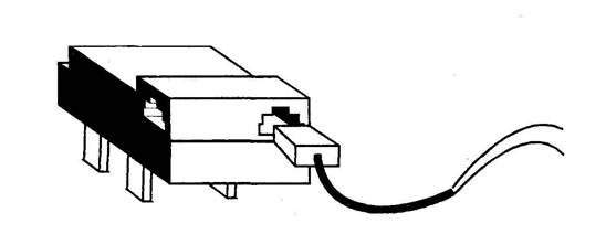 Рис. 12.5. Переходник для подключения модема к линии Затем подключить вилки компьютера и блока питания модема в розетки электросети. После этого можно непосредственно включать питание модема и компьютера в произвольной последовательности. Канальный разъем (LINE, WALL, SW, LL) предназначен для подключения кабеля, соединяющего модем с телефонным каналом. При этом можно использовать поставляемые с модемом или любые другие кабели, оборудованные разъемами типа RJ11, RJ12, RJ41 или RJ45. У многих модемов имеется гнездо для подключения телефонного аппарата (PHONE). Именно сюда и нужно подключать оставшийся без дела телефон. В этом случае при отсутствии модемной связи телефон можно будет использовать по своему прямому назначению. Параллельное подключение модема и телефона является нежелательным. В общем случае модем должен быть "первым" или единственным потребителем используемой телефонной линии. В случае, когда имеются параллельные телефоны, блокираторы и другие "полезные" устройства, необходимо сделать подключение модема, близкое к изображенному на рис. 12.4. Конструкция отечественной телефонной вилки и розетки несколько отличается от стандарта RJ11. Поэтому для подключения модема к линии необходим специальный переходник (рис. 12.5) Переходник можно изготовить самостоятельно из кабеля, входящего в комплект модема, и стандартного телефонного набора "вилка/розетка". Для этого необходимо: > аккуратно разделить кабель на две равные половины и очистить их концы от оплетки на длину 3—4 см; > отделить красную и зеленую жилы и очистить их от изоляции на длину 1,5—2 см; > незадействованньте жилы нужно укоротить и изолировать; > очищенные от изоляции проводники необходимо подключить к телефонной вилке/розетке в соответствии с приводимой на рис. 12.6 схемой. При этом надо учитывать, что разъем RJ11 имеет четыре контакта из которых используется только два центральных.