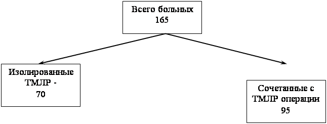 Рис 5. Структура поражений коронарных артерий по данным коронарографии Следует отметить, что наиболее часто (37,5%) имело место сочетание нескольких видов поражения КА, которые не позволяли выполнить прямую реваскуляризацию миокарда. Для определения показаний к ТМЛР данных одной коронарографии недостаточно. Вторым обязательным условием отбора больных должно быть наличие жизнеспособного миокарда в зонах предполагаемого лазерного воздействия. При планировании больных на ТМЛР получение информации о жизнеспособности миокарда важно одновременно с нескольких позиций: 1) Рассчитывать на эффективность ТМЛР можно только при условии наличия жизнеспособного миокарда. 2) Определение зон обратимой дисфункции миокарда ЛЖ позволяет наметить зону лазерного воздействия при ТМЛР. 3) Поскольку рубцовая ткань не подлежит реваскуляризации, обнаружение рубцовых изменений в миокарде является противопоказанием к ТМЛР. 4) Дооперационная топическая идентификация зон с мелкоочаговыми рубцовыми изменениями миокарда позволяет наметить зоны лазерного воздействия. Ориентирование в топике зон рубцового поражения миокарда позволяет предотвратить формирование лазерных каналов в этих зонах и предотвратить расширение этих зон. Оценку жизнеспособности миокарда мы проводили с помощью следующих методик: 1) добутаминовая стресс-эхокардиография, 2) однофотонная эмиссионная компьютерная томография или планарная сцинтиграфия миокарда. При первичном отборе больных по материалам коронарографии на возможность выполнения ТМЛР было отобрано больше больных. Однако, по данным ОФЭКТ у 67% пациентов были выявлены обратимые дефекты перфузии, которые визуализировались только на нагрузке и замедленное вымывание РФП в данной области. Во всех этих случаях миокард был расценен как жизнеспособный (ишемизированный) и всем этим больным была рекомендована ТМЛР. У 33% пациентов были выявлены необратимые дефекты перфузии на исходных и ранних отсроченных изображениях. Всем этим больным было проведено дополнительное исследование с реинъекцией 201Tl, после чего у этих больных дефекты перфузии значительно уменьшились в размерах, что послужило основанием идентифицировать эту зону как мелкоочаговые рубцовые изменения или рубцовые изменения с жизнеспособным ишемизированным миокардом. У 4 больных дефекты перфузии сохранялись и на изображениях, полученных после реинъекции 201Tl. Такой миокард был расценен как нежизнеспособный и соответствовал рубцовому поражению или аневризме ЛЖ. Этим больным было отказано в ТМЛР. Таким образом, исходными показаниями к применению изолированной ТМЛР явились: 1) выраженная клиника стенокардии, рефрактерная к обычной антиангинальной терапии; 2) невозможность выполнения АКШ, либо ТЛБАП в связи с диффузным поражением коронарных артерий (КА), поражением дистального русла или наличием мелких, нешунтабельных КА; 3) наличие в области планируемой операции жизнеспособного миокарда или зоны риска ишемии. Показания к операции мы вырабатывали на основании сопоставления возможностей метода в лечении ИБС и сложности выбора другой стратегии лечения с учетом современных представлений и тенденций, опыта, накопленного в процессе применения ТМЛР. 3.3 Показания к сочетанным операциям ТМЛР Во всех сообщениях по ТМЛР выявлено значительное (в разных ис