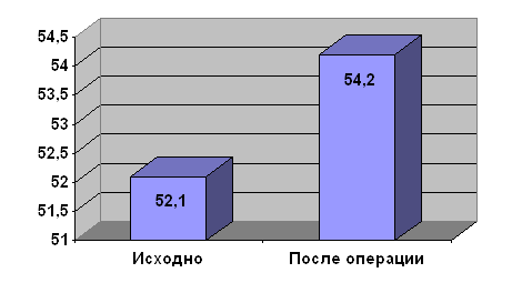 Рис. 23. Потребность в нитроглицерине у больных с сочетанными операциями до и через 3 месяца после вмешательства По данным ВЭМ толерантность к физической нагрузке достоверно улучшилась. Так, до операции 82,6% пациентов имели порог толерантности к физической нагрузке не более 100 Вт. Через 3 месяца после операции этот показатель составил 31,9%. Динамика изменений общей ФВ ЛЖ после операций представлена на рис. 24.