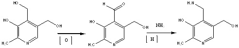 пиридоксин пиридоксаль пиридоксамин Процесс обращения может идти в обратном направлении. Основным лекарственным веществом витаминов группы В6 является пиридоксина гидрохлорид. Сравнительно несложная химическая структура позволила осуществить синтез пиридоксина из алифатических соединений. Известно много различных вариантов синтеза. Наиболее эффективный из них основан на циклизации N-формил-D,L-аланина, с последующей его циклоконденсации с эфиром 1,4-бутендионовой кислоты. Полученный бицикл в кислой среде расщепляется в производное пиридина, которое гидрируют до пиридоксина: